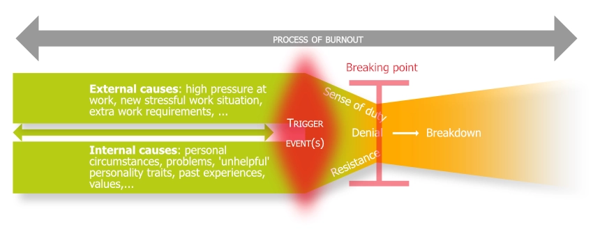 Baer argues that burnout is not a separate illness. It’s mainly a crisis after being in a difficult situation that gets even more difficult. It’s far more complex than the name suggests. It’s also more than a moment in time, i.e.: the moment the burnout event occurs. It has a build up long before the event and has consequences long after the event as well. In the programme they claim that on average, it takes 6 months for someone suffering from burnout to re-enter the world of work. There is also no quick solution.
