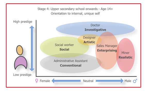 - It can also support clients in understanding ‘where they went wrong’ so they won’t make the same mistake again. Having said that, understanding the cognitive and intellectual stages of development in relation to career choice as a child may have limited validity when you’re an adult. I would argue however that understanding the principles of power, sex roles, social values and who they are, as well as who they have become as a unique self, can offer valuable insight for the client in some cases. In this sense, the application of Gottfredson’s theory moves closer to the narrative approach in picking out, not role models, but strong influences on the client’s developmental story.