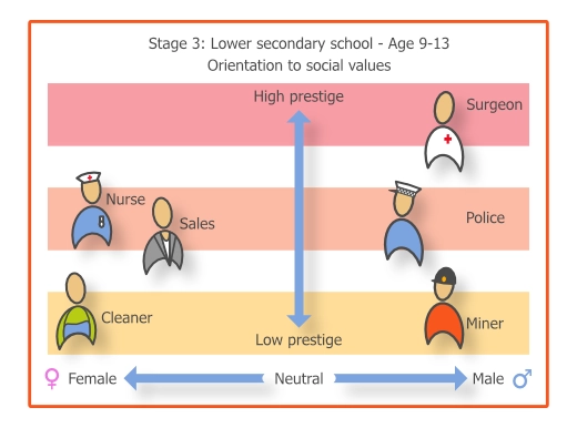 What are your thoughts about this? Do the changes in society make Gottfredson’s theory less valid? A clear example is that of the different sex roles within careers. As young adults and especially as adults we can see the relativity of the value of assigning biological sex to the suitability of a career, however strongly it’s still prevalent in society. Gottfredson suggests children have not developed this relativism yet. Do you feel that this makes children in between 6 and 8 impermeable to societal changes in sex roles? Or are their ideas more sophisticated than previous generations of children of that age, and does Gottfredson’s assertion of the role of gender roles play a lesser part in children’s career learning? Think back on your own life and situation and if you can, the jobs you were thinking of when you were in between 4 and 6. Now explore this with children of that age in the present, if you can, and notice the differences, if there are any.